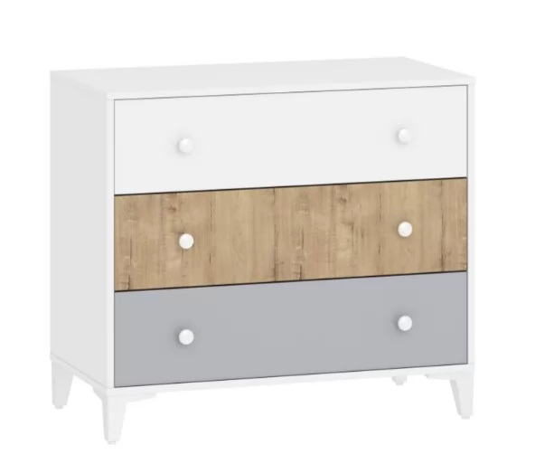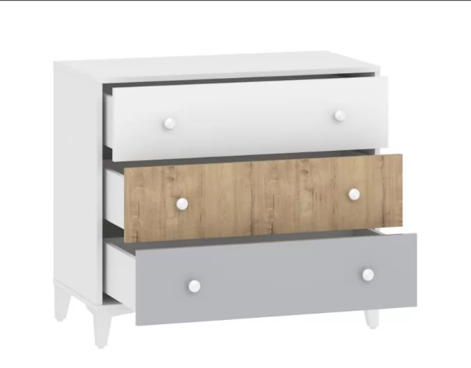 Комод «Морти» -  прекрасный выбор для интерьера в стиле Современный, Модерн, Скандинавский. Три удобных выдвижных ящика станут вместительным место для хранения белья, предметов одежды и аксессуаров. В оттеночной гамме мебели царит стильное сочетание современности, изюминкой модели являются цвета ящиков: белый, серый и дуб бунратти. Выдвижные ящики оснащены шариковыми направляющими полного выдвижения, равномерно распределяют вес содержимого и обеспечивают плавный бесшумный ход ящика. Высокие опоры зрительно облегчают конструкцию и более удобны для уборки.