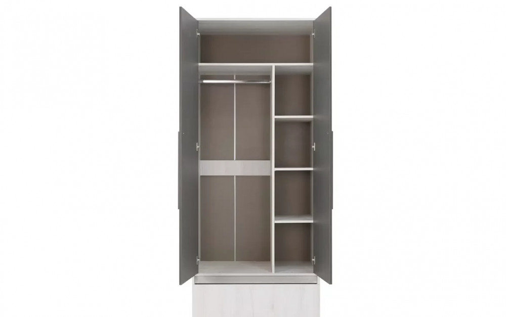 Шкаф двухстворчатый с выдвижным ящиком снизу позволит вместить все вещи подростка в одно место. Изделие оснащено 5 полками, 1 штангой и 1 ящиком.