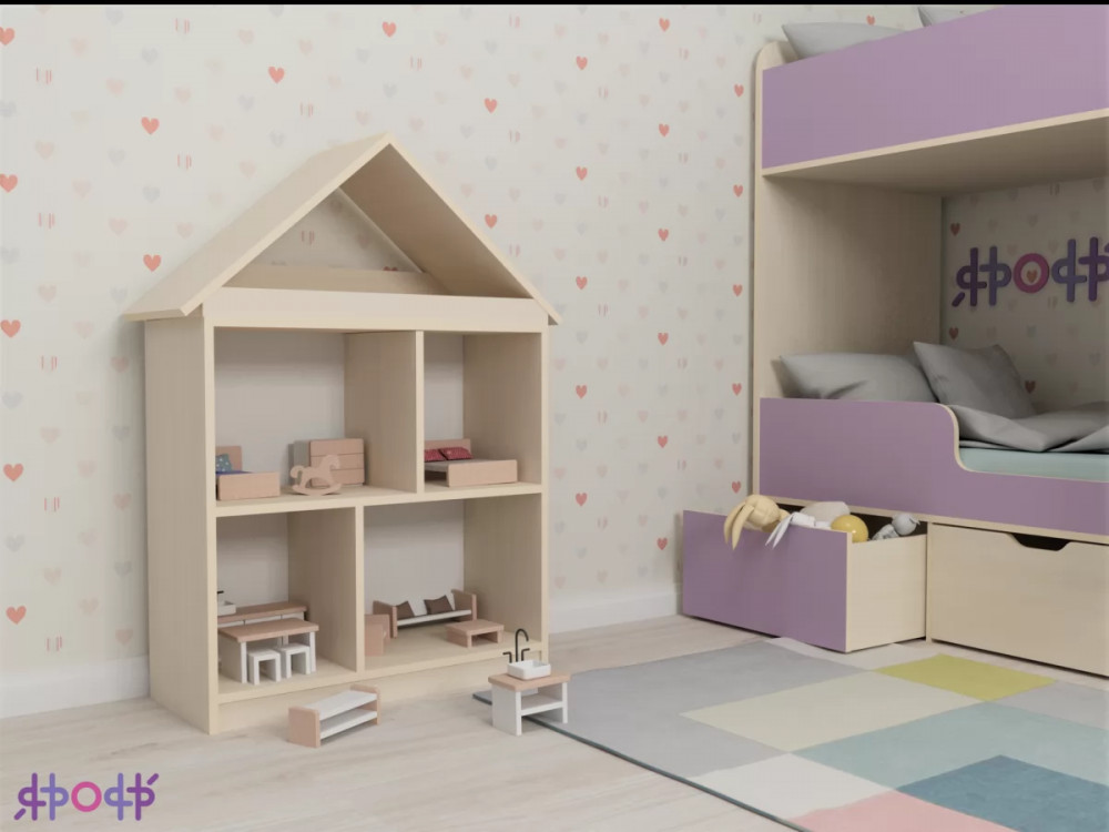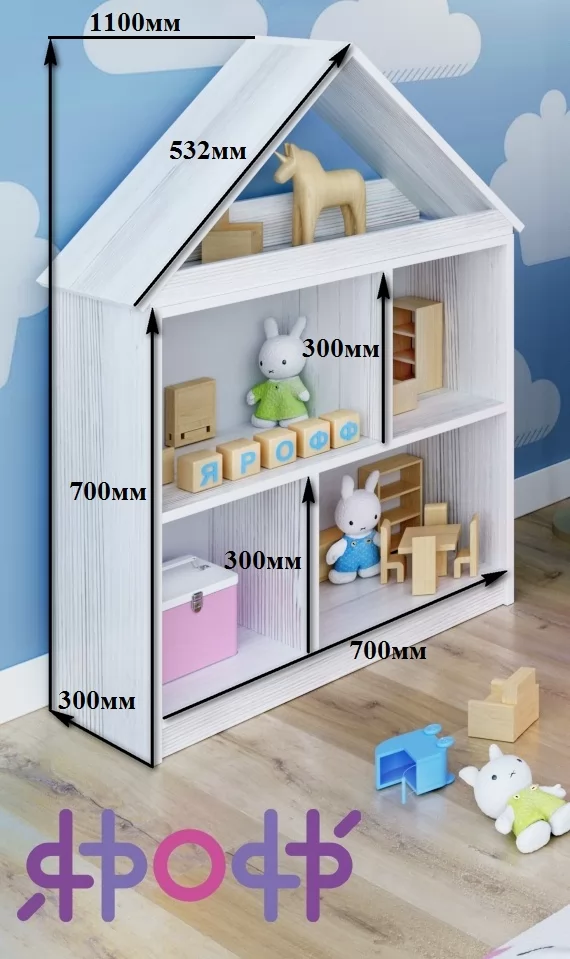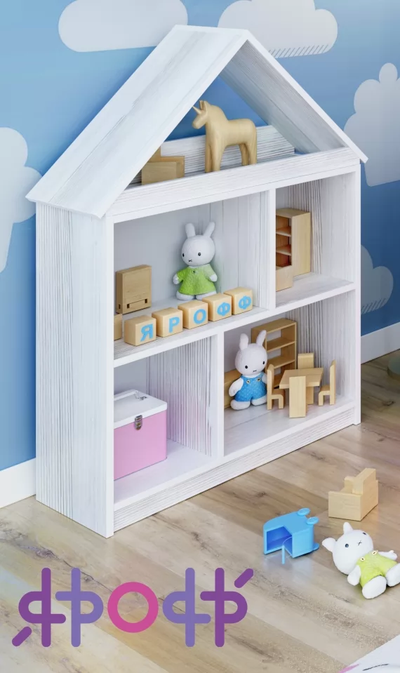 Данный модуль можно использовать не только, как игровую зону, но и в качестве напольного стенда для хранения игрушек, сувениров, наград и книг. Кроме того, дом для кукол можно поставить на комод или тумбу с целью размещения на нем различных мелочей. Изделие состоит из трёх ярусов, внутри которых имеются 1-2 открытых отделения.