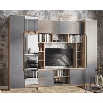 -все предметы изготовлены в одном стиле, словно детали одного конструктора, позволяют создать уникальную комбинацию гостиной; -слегка шероховатая матовая текстура фасадов благородного серого цвета с эффектом декоративной штукатурки в сочетании с -корпусом, выполненном под натуральный дуб подчеркнут ваш безупречный вкус и индивидуальность; -трендовые цветовые решения, строгий фасад и отсутствие лицевой фурнитуры делают коллекцию не только стильной, модной, но и практичной.