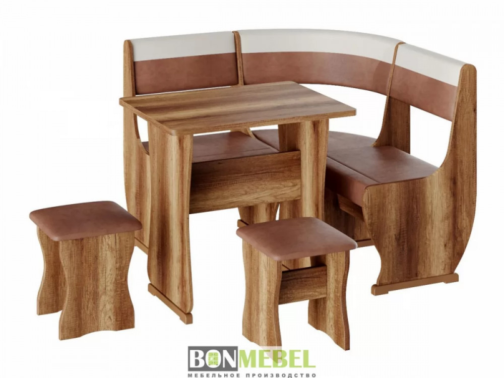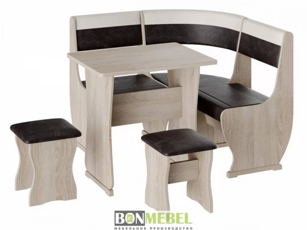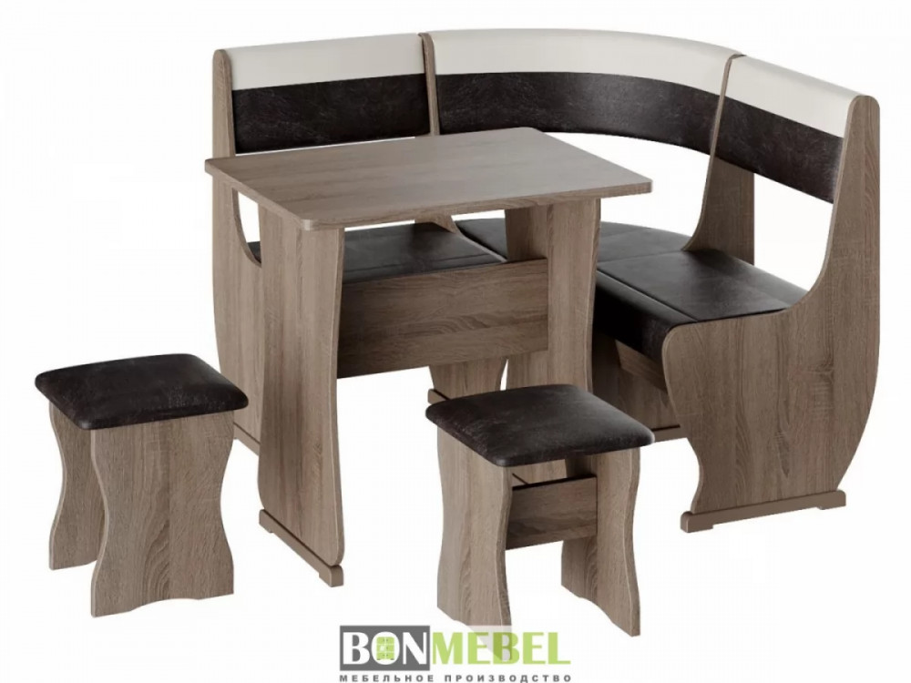 Кухонный уголок Уют 1 мини — сочетание практичности и современного стиля исполнения. Композиция поможет выгодно оформить обеденную зону, рассчитанную на четыре персоны. Преимущества: универсальная сборка — вы сможете выбрать ориентацию угла скамьи при сборке; обивка из экокожи — данный материал устойчив к различным загрязнениям и не требует обработки специальными средствами; ящик для хранения — под сиденьями расположены вместительные ниши для хранения различной кухонной утвари и других нужных вещей.