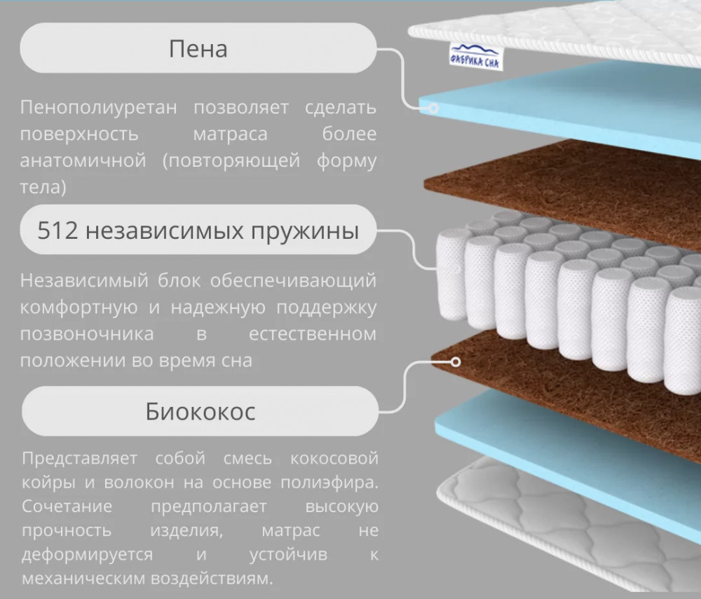 Серия: Sleep Высота: 20 см Нагрузка на спальное место: 130 кг Тип конструкции: Независимые пружины Степень жесткости: Средний Наполнитель: Био-кокос, Пенополиуретан Ткань: Трикотаж Чехол: Трикотаж на синтепоне Состав: Пенополиуретан - 2 см/Био-кокос 1 см/Блок независимых пружин/Био-кокос 1 см/ Пенополиуретан - 2 см