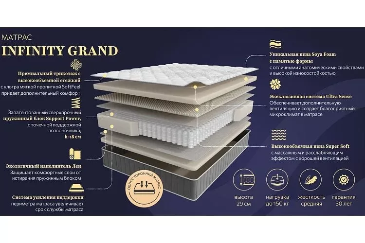 Матрас INFINITY GRAND 1600*2000мм (Пена/лен, ср.жесткий, h 29см)
