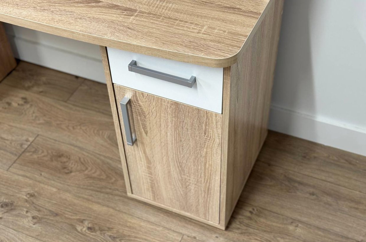 Стол выполнен из качественного материала ЛДСП в цвете дуб сонома с белыми элементами. Особенностью дизайна являются радиусные элементы и утолщенная столешница толщиной 25 мм. Для расширения функциональности стола рекомендуется дополнить его надстройкой и стеллажом из той же серии Лайт-1.
