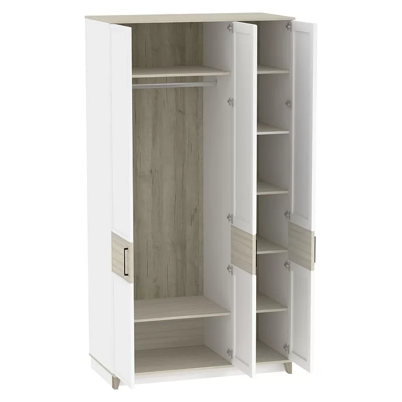 Изысканность стиля подчеркивает тонкий фигурный профиль на фасадах, верх и низ модулей выполнены в древесном декоре, а скошенные опоры из МДФ добавляют мебели в стиле неоклассика из коллекции AURELIO нотку современной эстетики. Петли с доводчиками - для комфортного открывания / закрывания дверок шкафа. Задняя стенка шкафа в древесном декоре устанавливается в паз, поэтому выглядит аккуратно со всех сторон.