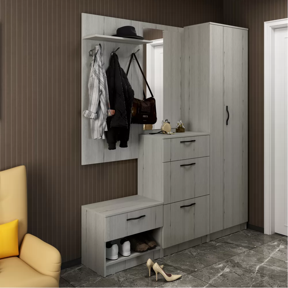 Универсальный шкаф для прихожей - небольшой глубины, при необходимости можно установить полки и складывать вещи, или использовать штангу и вешать одежду на плечики.