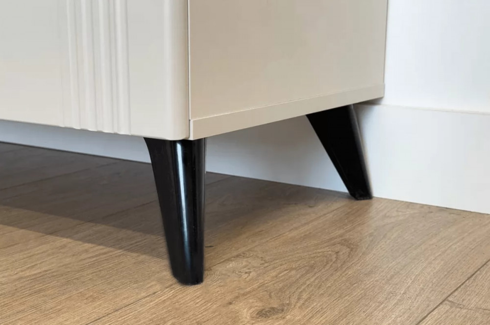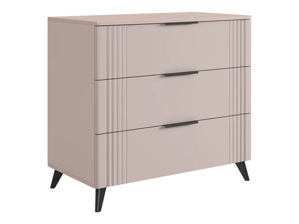 Комод изготовлен из качественных материалов: корпус выполнен из ЛДСП, что гарантирует прочность и долговечность, а фасад, выполненный из МДФ в плёнке ПВХ, не только выглядит эстетично, но и защищает комод от повреждений. Особое внимание заслуживает фрезеровка фасадов, которая придаёт изделию изысканный вид.