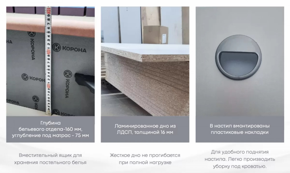 Cпинка оптимальной высоты, благодаря чему кровать хорошо будет смотреться в спальной комнате как с невысокими, так и с высокими потолками.