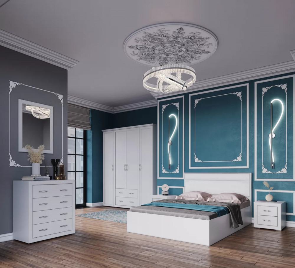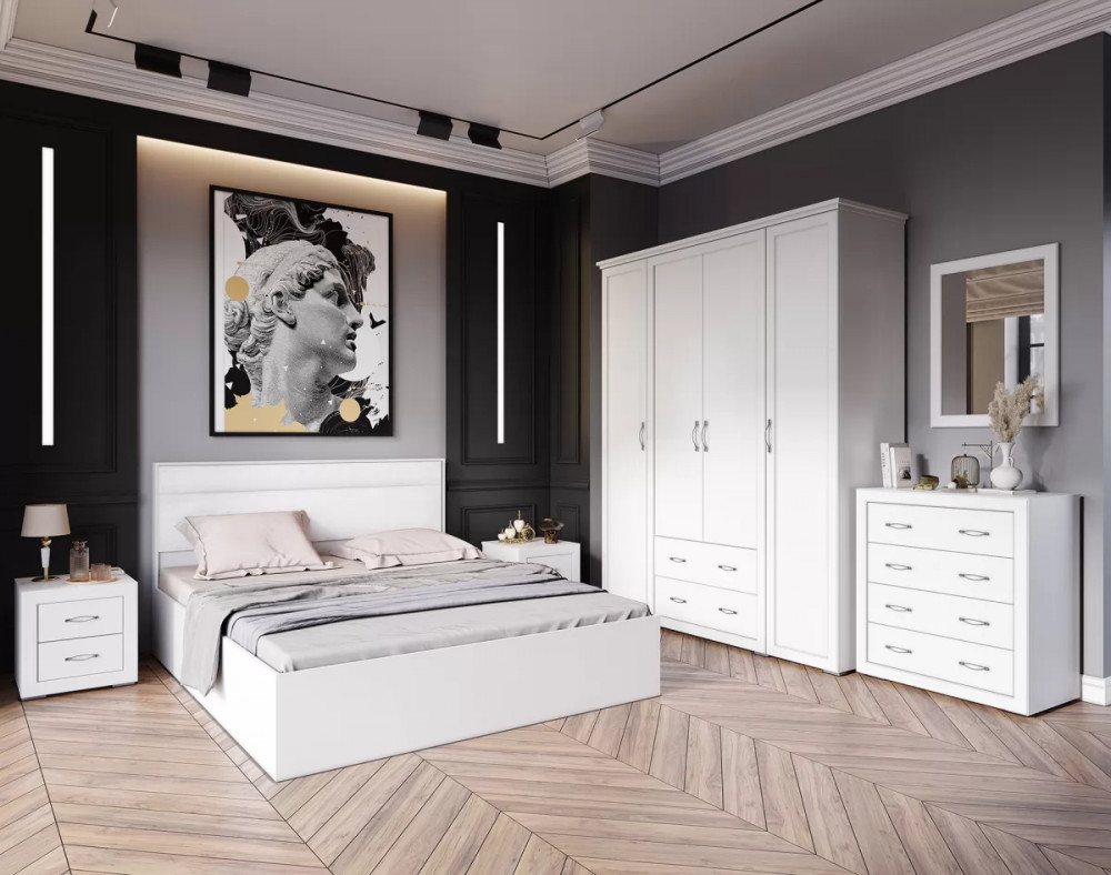 4 варианты основания для кровати: настил из ДСП 2С, настил из ЛДСП, ортопедическое на опорах, ортопедическое с подъемным механизмом и ящиком для хранения белья, рамочный профиль из МДФ, облицованный белой финиш-пленкой