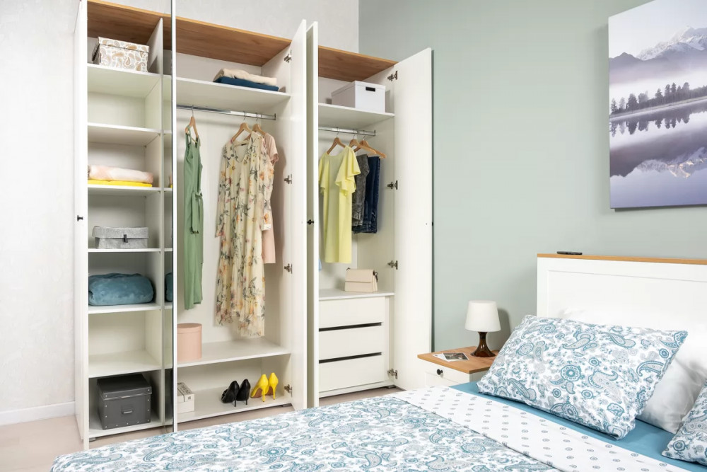 В изголовье кровати предусмотрены вместительные ниши. Шкафная группа полноценной глубины