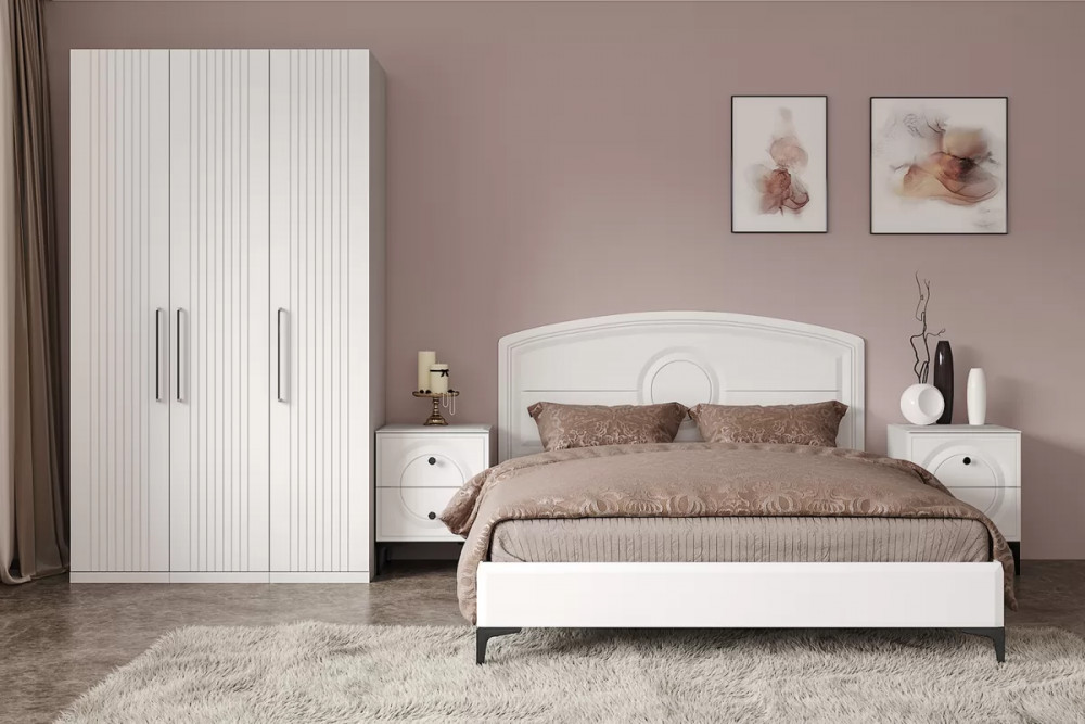 • Основным декоративным элементом коллекции является круг. Явно представленный фрезеровкой по фасадам тумбы, комода, в изголовье кровати и ручках-кнопках.