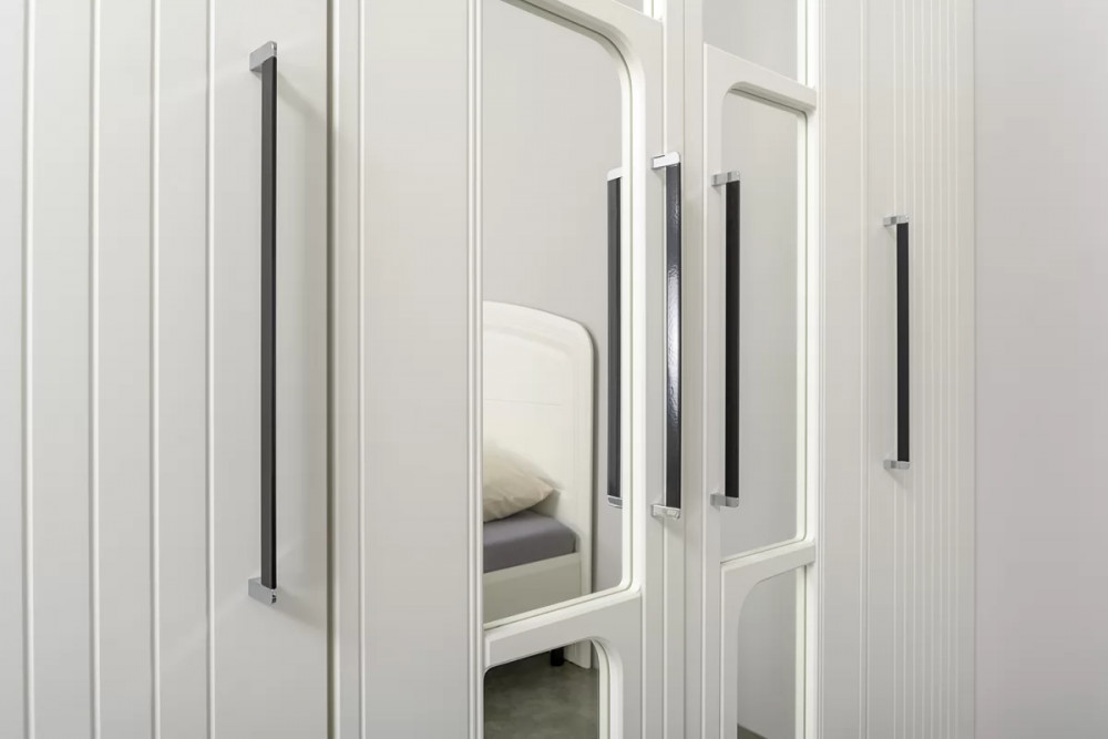 • Фасады выполнены из МДФ с матовой ПВХ-плёнкой. Такое решение делает мебель визуально более "мягкой", комфортной и расслабляющей, что особенно актуально для спальни.