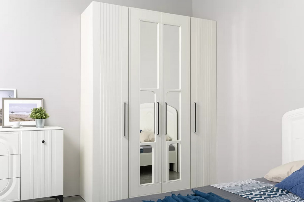 • Нестандартно и интересно решён декор двустворчатого шкафа. Зеркало накладывается изнутри фасада, проявляя таким образом сквозную ажурную фрезеровку.