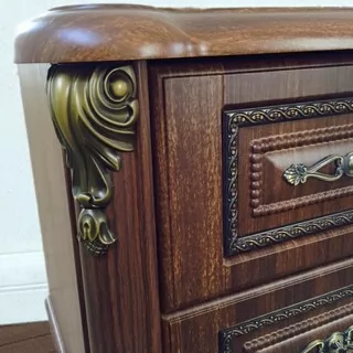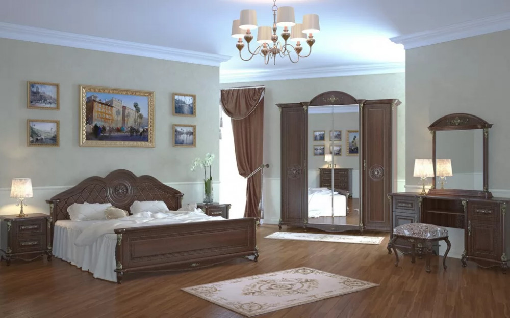 Спальный гарнитур выполнен в классическом стиле. Это изысканный дизайн с резными элементами и декором. Овальное изголовье, рисунки на фасадах, придают мебели для спальни эффект дороговизны и благородства. Такая спальня способна восхищать и удивлять. Вы можете приобрести как весь комплект, так и по отдельности. Изделия отвечают всем стандартам и имеют длительный срок эксплуатации.